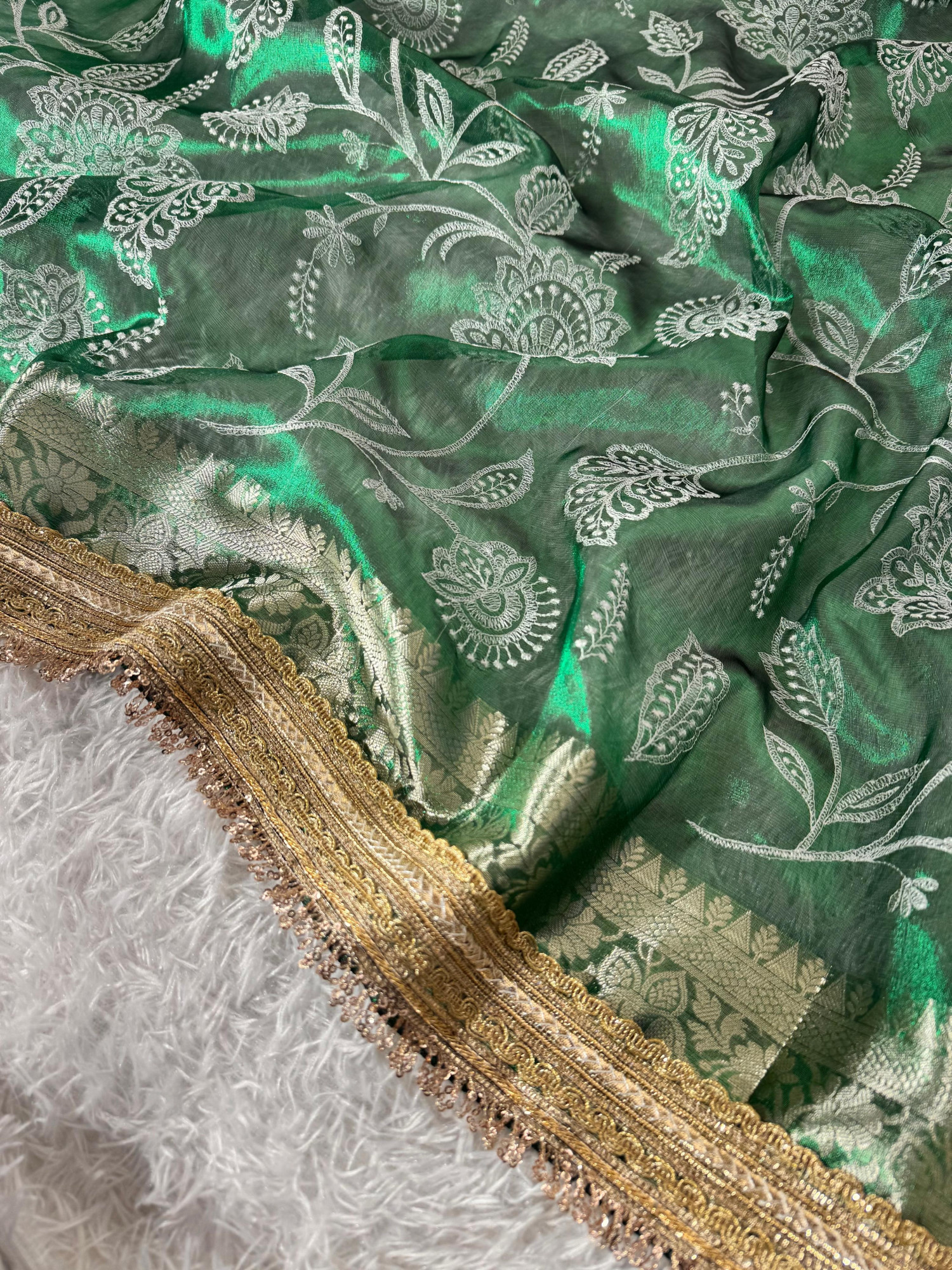 Indulge in the luxurious feel of our Premium Chikankari Work On a Banarasi Tissue Fabric. Made with the finest quality Tissue silk, it offers a lightweight and comfortable drape while exuding elegance and sophistication. Elevate your style and make a statement with this must-have saree Dual Tone Chikankari Saree.