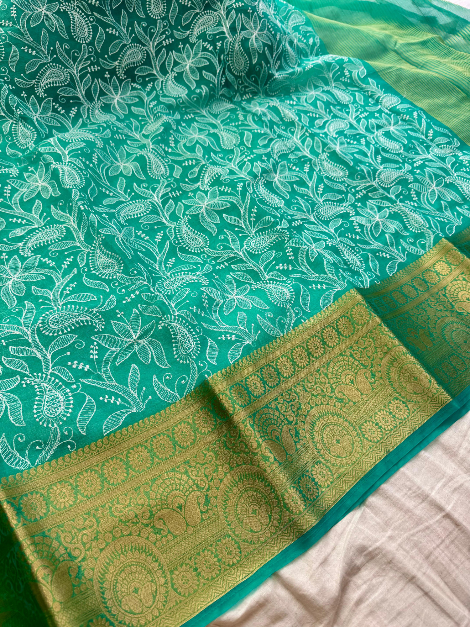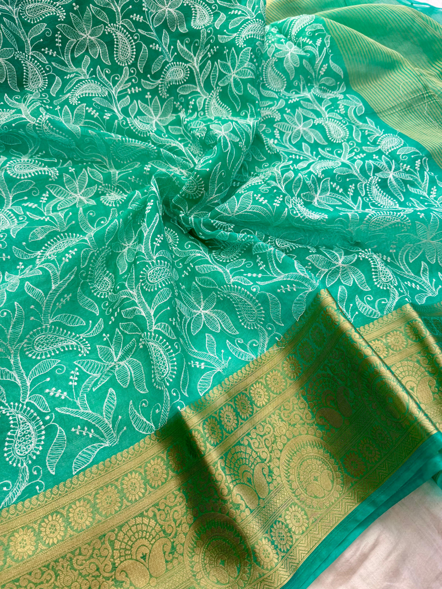 Indulge in the luxurious feel of our Premium Chikankari Work On a Shimmer Organza Fabric. Made with the finest quality silk, it offers a lightweight and comfortable drape while exuding elegance and sophistication. Elevate your style and make a statement with this must-have saree.