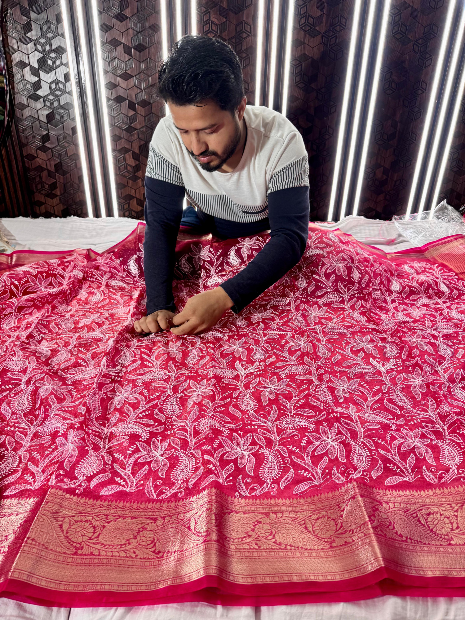 Indulge in the luxurious feel of our Premium Chikankari Work On a Shimmer Organza Fabric. Made with the finest quality silk, it offers a lightweight and comfortable drape while exuding elegance and sophistication. Elevate your style and make a statement with this must-have saree.