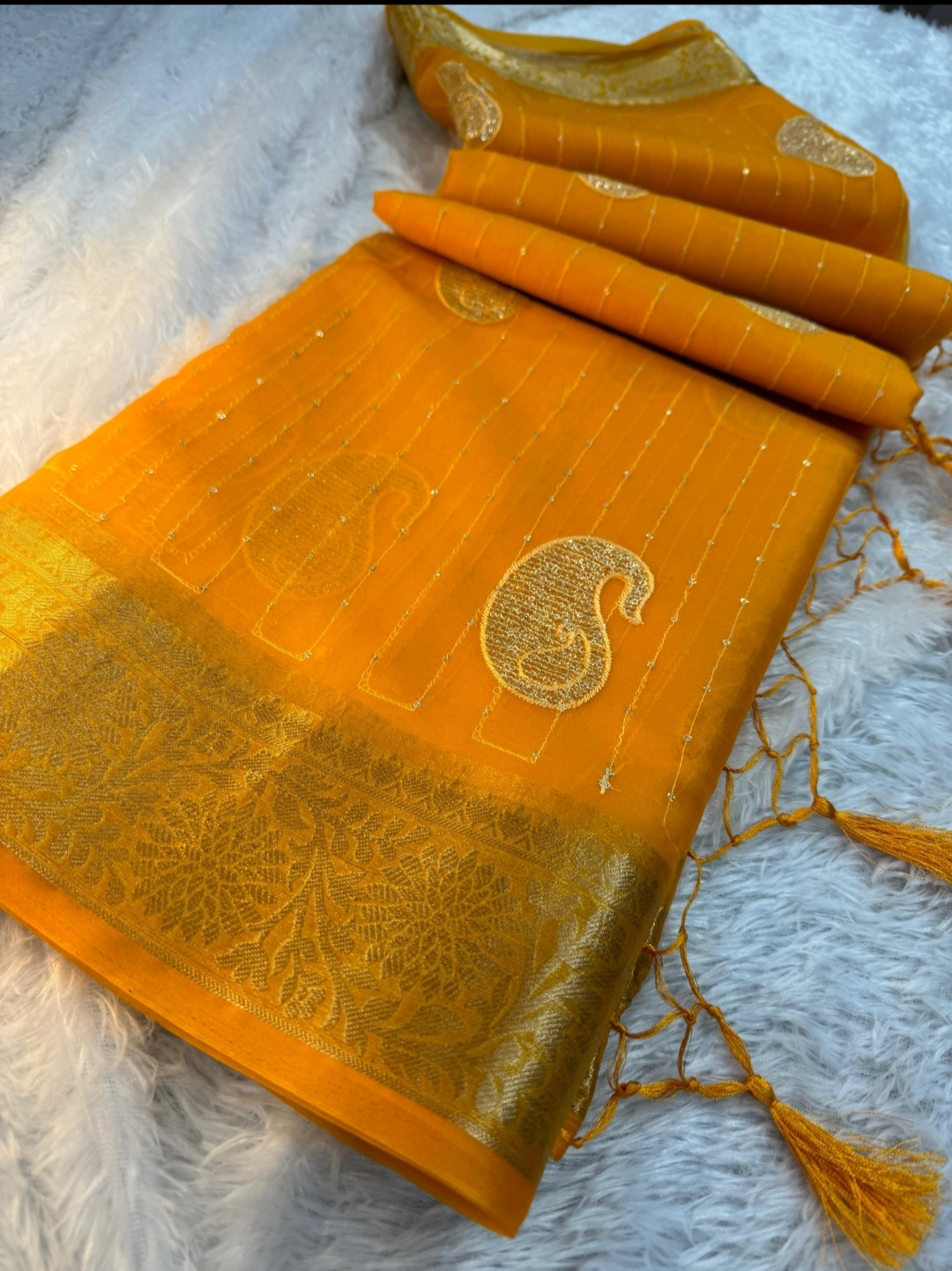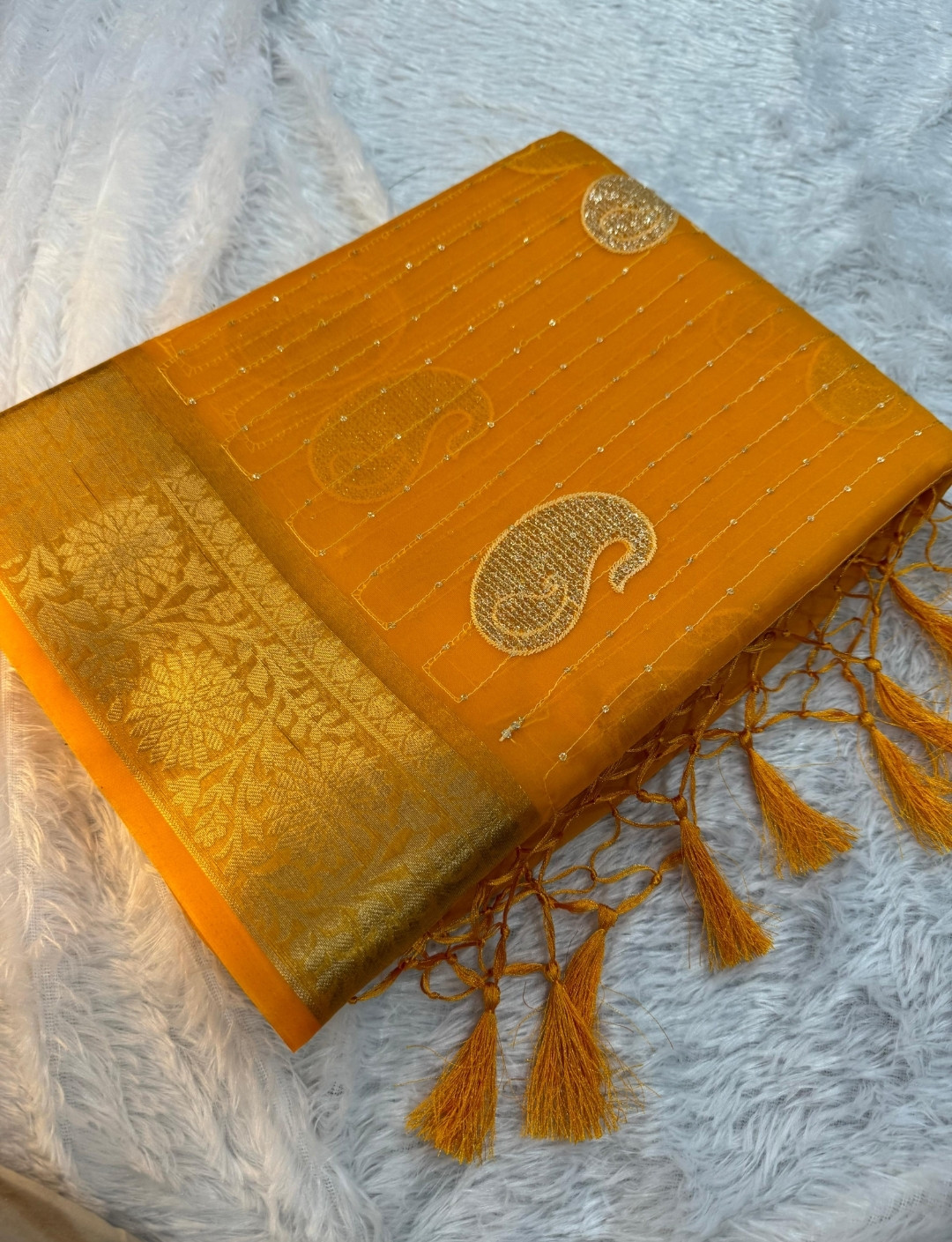 Organza Silk Saree with Sequence Embroidery Work and Tassels