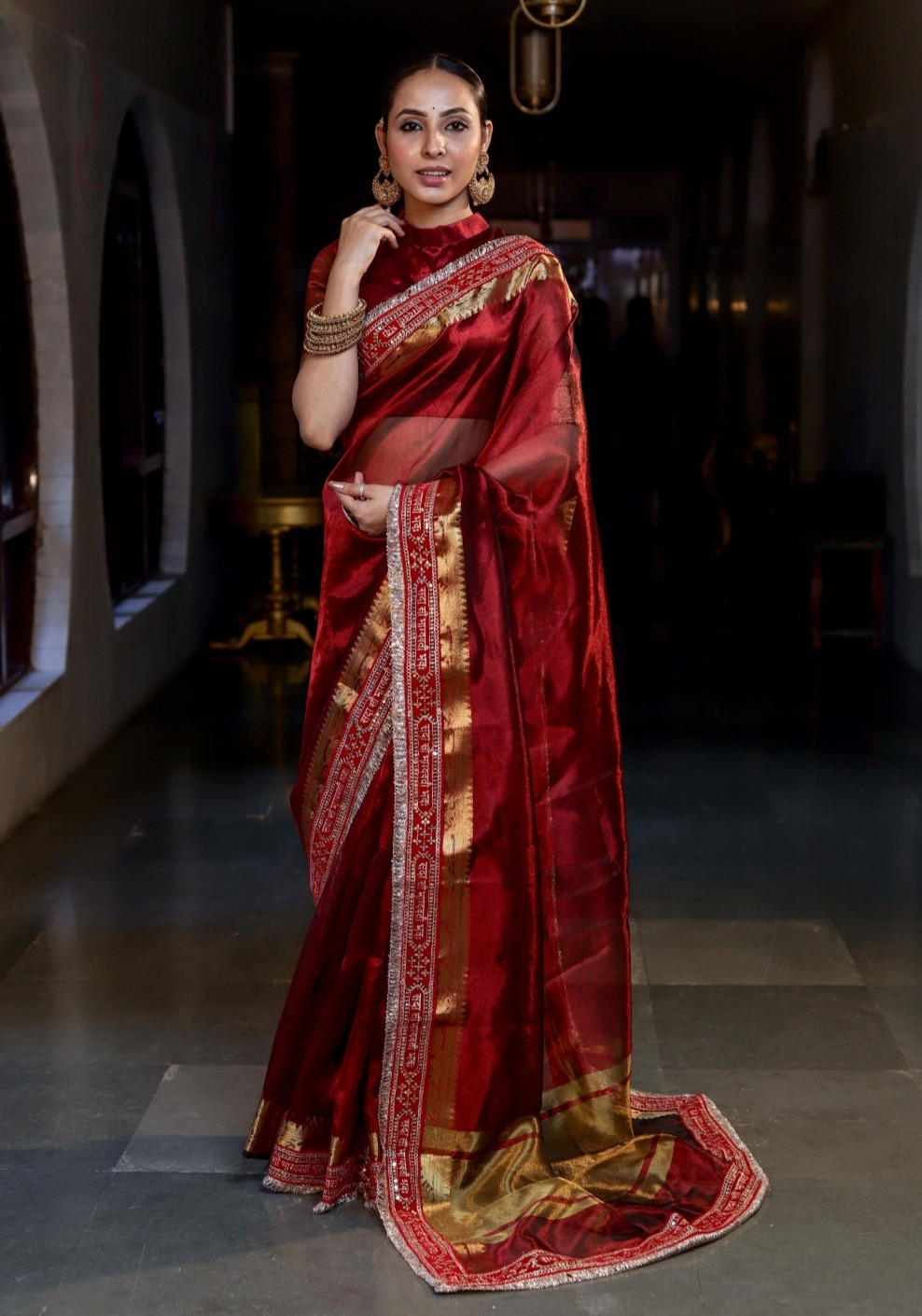 Organza Silk Party Wear Saree With Zari Border and Tassels