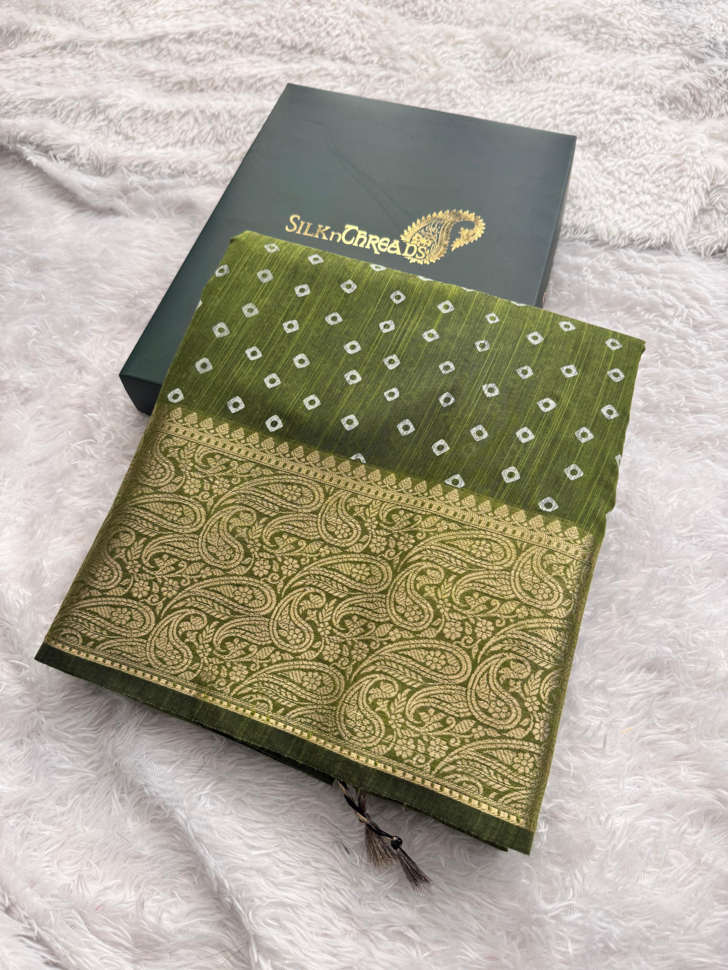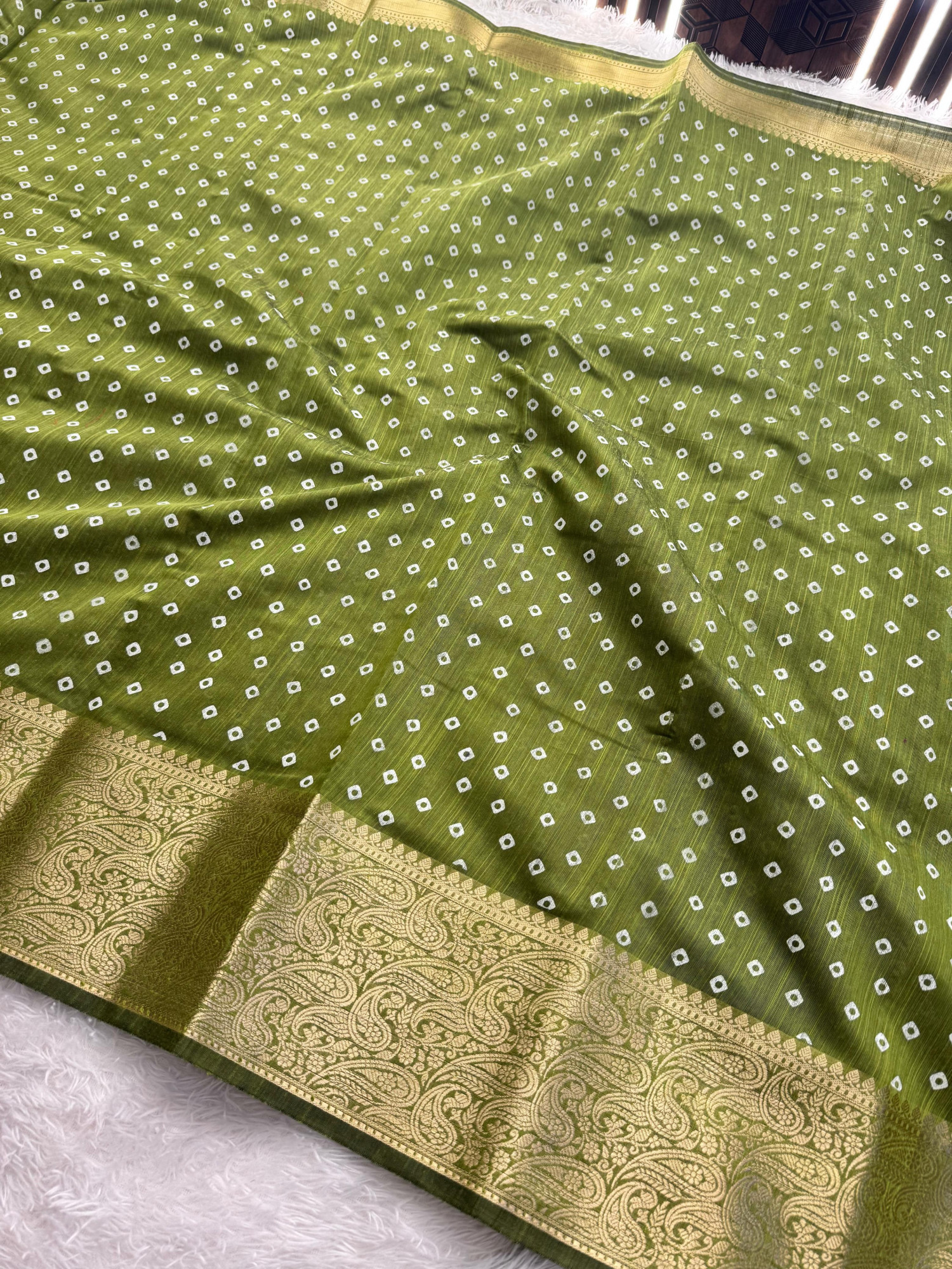 Premium Linen Silk Saree with Copper Zari Border and Bandhani Print