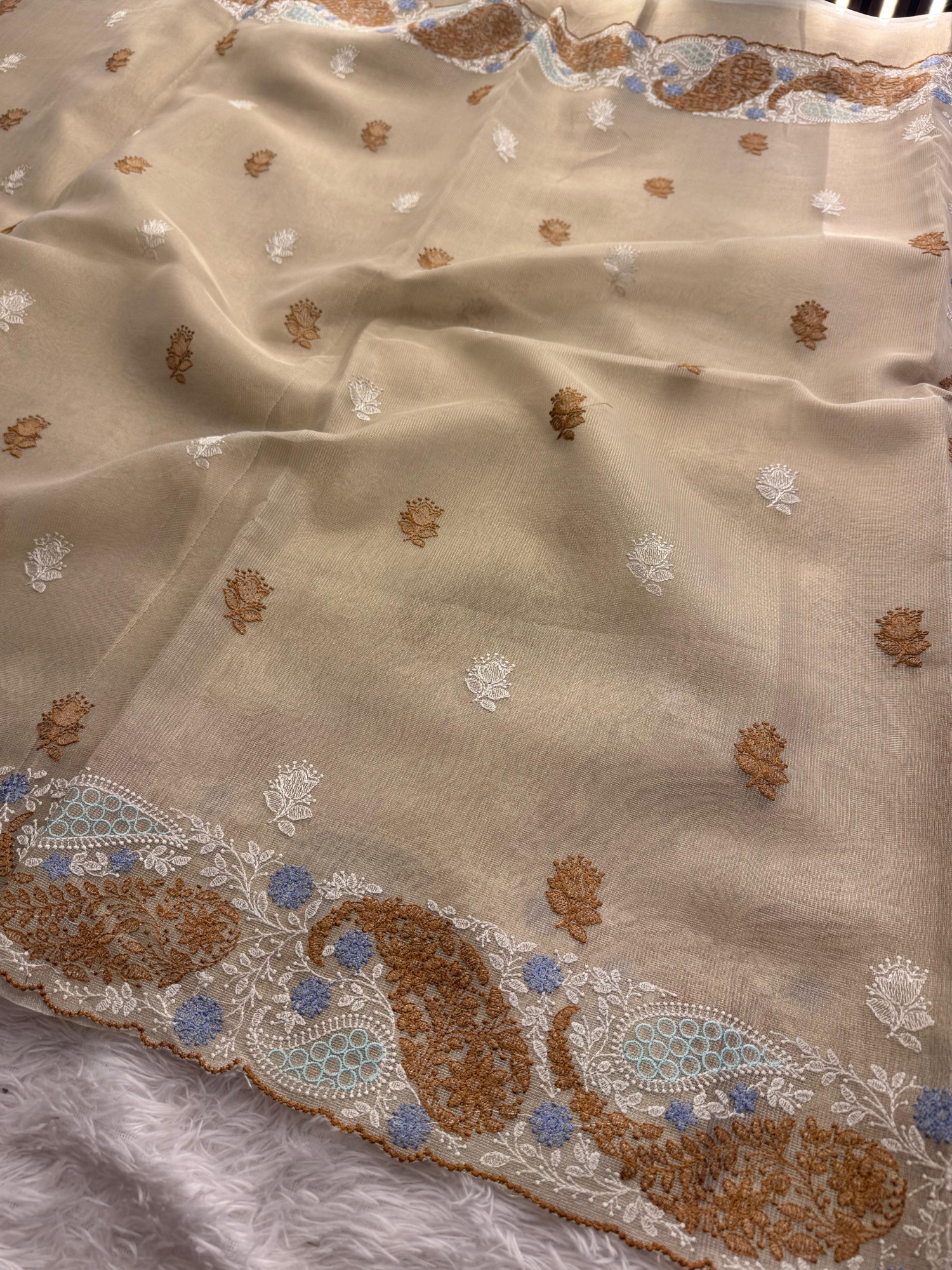 Premium Tissue Banswara Silk Resham Embroidery Work Saree With Designer Embroidery Pallu