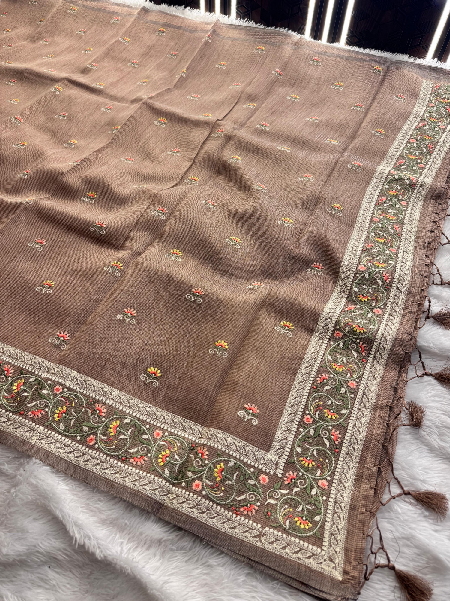 Premium Tissue Banswara Silk Resham Embroidery Work Saree With Designer Embroidery Pallu