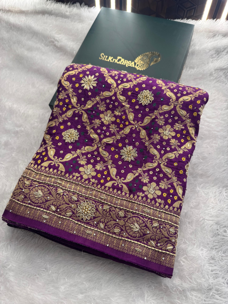 Pure Viscose Silk Banarasi Zardozi Handwork Work Bandhani Saree