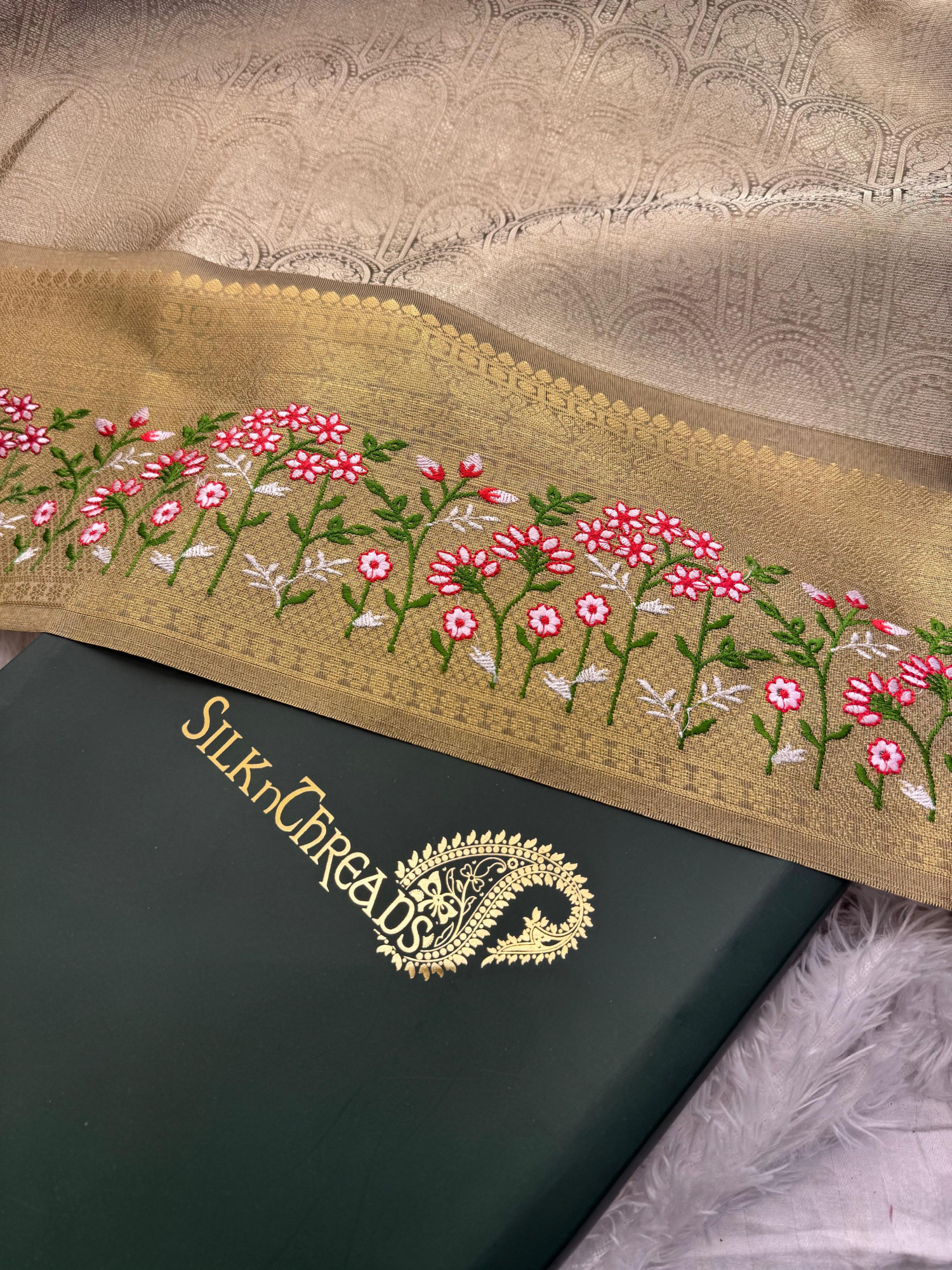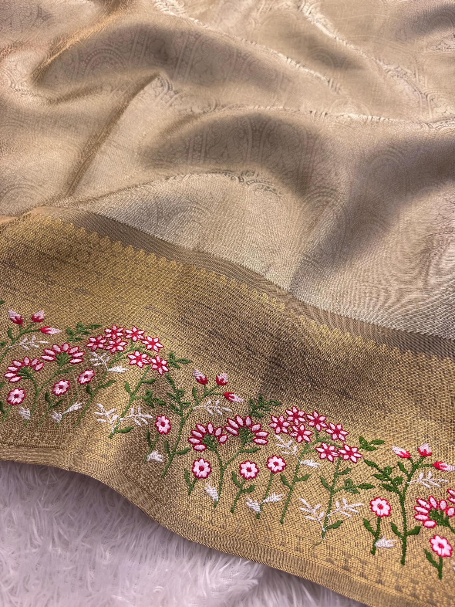 Never Seen Before Banarasi Tissue Resham Embroidery Work Saree With Banarasi Zari Border